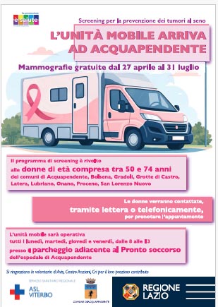 L’unità mobile sarà operativa tutti i lunedì, martedì, giovedì e venerdì, dalle 8 alle 13 presso il parcheggio adiacente al Pronto soccorso dell’ospedale di Acquapendente.